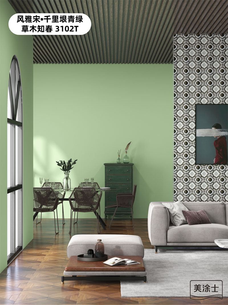 卡卡湾88国潮色草木知春3102T,弱化了复古绿的陈旧感,强化了空间的时髦感,与灰白软装的搭配,一明一暗的对比,一冷一暖的融合,奢华的质感与复古的气息碰撞,勾勒出低调的高级时尚感,让空间的气场和颜值达到峰值。