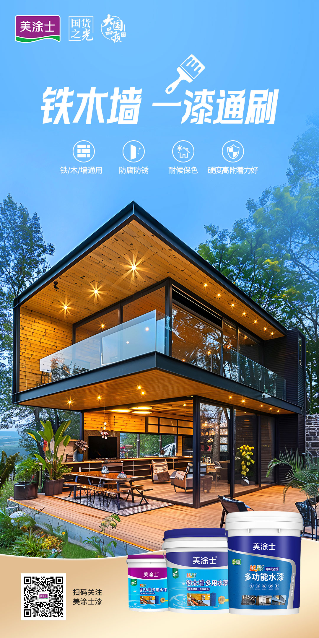 是一款新型水性环保涂料产品具有快速干燥功能漆 膜遮盖力好可高效提升施工交付效率。同时具备漆膜 致密抗菌防霉、耐候保色、防腐防锈等优异性能。适用 于室内外环境金属、木器、墙面、PVC铝塑板等多种基 材的多功能水漆。