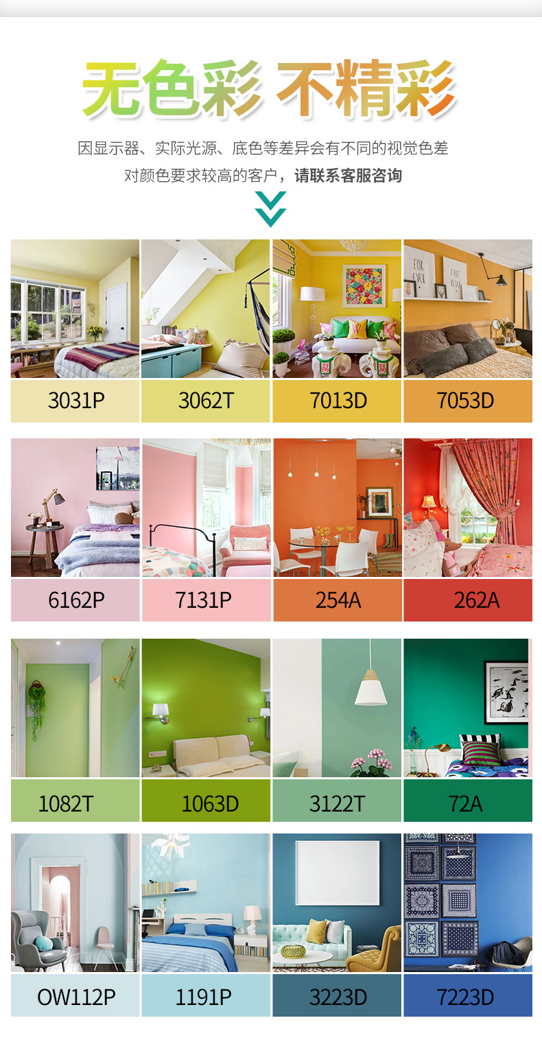 颜色分类: 更多颜色咨询客服 日光黄(7013D) 雏菊黄(7053D) 皇家蓝(7223D) 初生粉(6162P) 白色 晨光黄(3031P) 浓情绿(72A) 秋叶黄(3062T) 滇池蓝(1191P) 绒球粉(7131P) 淘宝橙(254A) 萨沙红(262A) 荧光绿(1082T) 翠竹绿(1063D) 薄荷绿(3122T) 鲁斯堡蓝(3223D) 曙光蓝(OW112P)