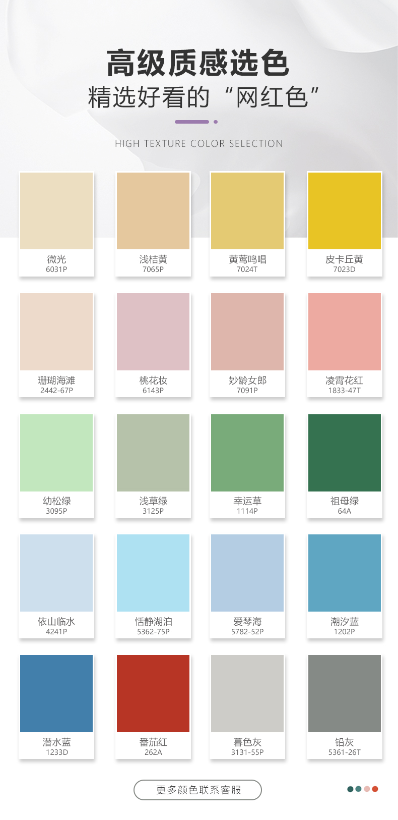 鸣唱 暮色灰 铅灰 依山临水 潜水蓝 潮汐蓝 幸运草 珊瑚海滩 幼松绿 浅桔黄 祖母绿 恬静